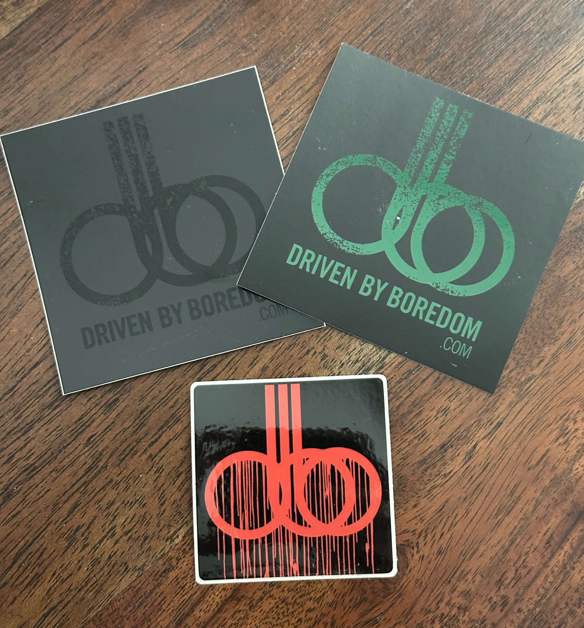Driven By Boredom stickers in Slime Green, Bloody Red and Goth Black, plus a creepy signed postcard from the Salton Sea.